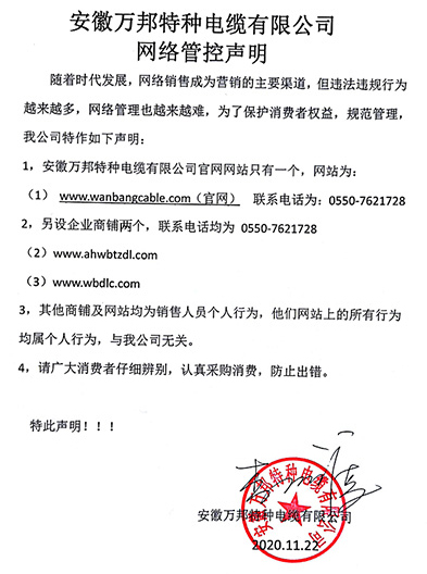 鄭重聲明:安徽萬邦特種電纜有限公司官方網站為:www_wanbangcable_com.ycmingyue.com,除此之外無任何子網站或合作網站,其余均為假冒偽劣。電話:0550-7621728 13485756353 地 址:安徽省天長市滁州高新技術產業開發區經四路29號